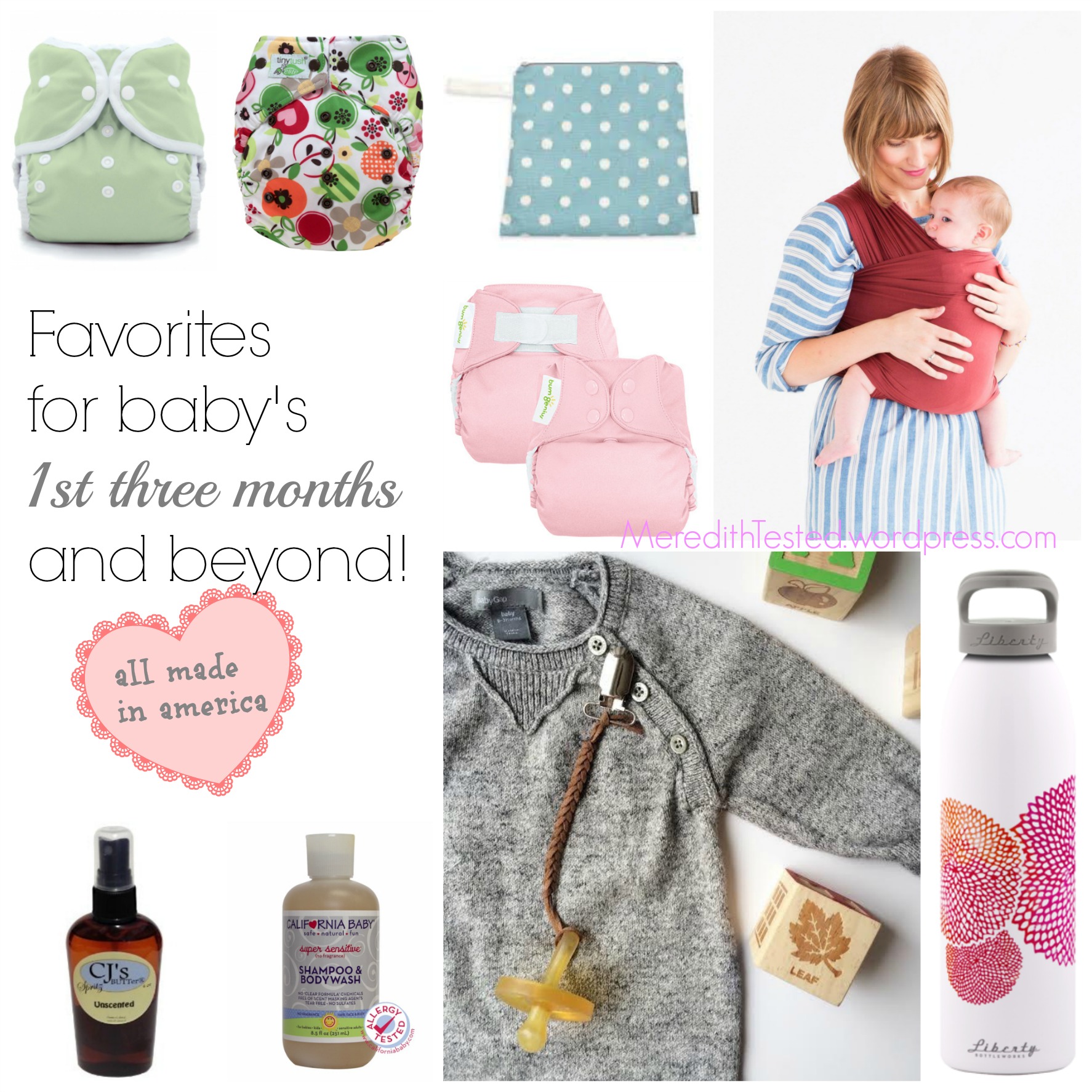 There are so many USA-made cloth diapers and diaper accessories from small makers and work-at-home-moms to larger companies. I’ve only scratched the surface of available brands, but my absolute favorites so far are: Thirsties* (I used the duo wrap size 1 with a prefold when my daughter was a newborn), BumGenius* (I mainly use BG 4.0 pocket diapers) and TinyTush (I like the Elite 2.0 pocket diapers style) for diapers and Geffen Baby (check out this handy chart to figure out which ones you need) for absorbent inserts. I highly recommend checking eBay* for new and like-new cloth diapers, but I also like the selection and customer service at Sweetbottoms Baby*. - Solly Baby Wrap (buy on eBay*)