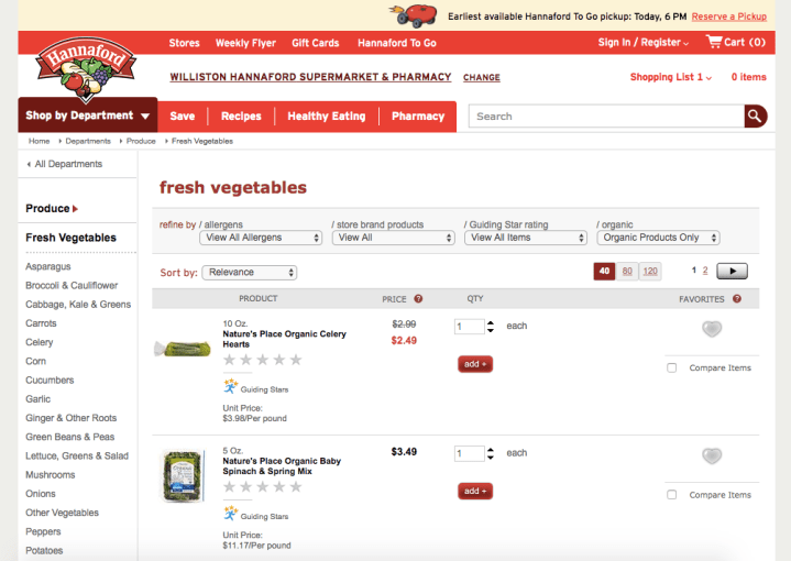 Your first step is to login to the Hannford To Go site and select your local store. From there you can navigate to different sections just as you would if you were walking around the store. You can select for organic only and you can use the search function to find specific brands or items.